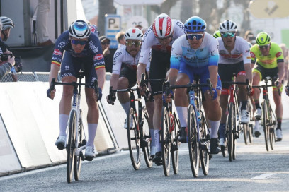 Tim Merlier (Alpecin-Fenix) unggul beberapa milimeter atas Dylan Groenewegen (BikeExchange-Jayco).