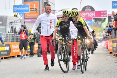 Mitchelton-Scott benar-benar berpesta di puncak Mount Etna, di penghujung Etape 6 Giro d’Italia 2018, Kamis (10 Mei). Dua pembalapnya finis bersamaan, meraih sukses maksimal.